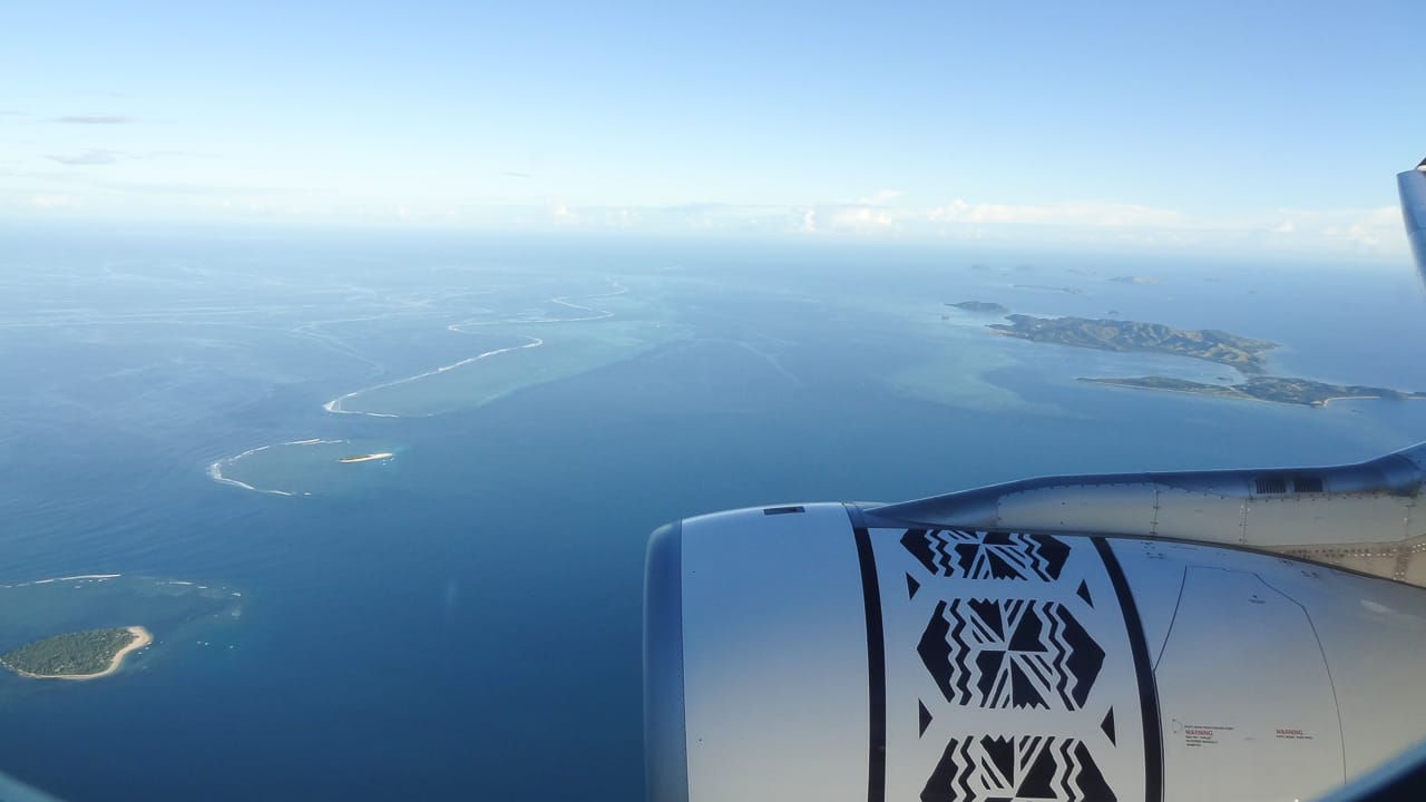 Our first view of some of the 333 islands that make up Fiji as a whole from our completely full Fiji Air 380-200 was well worth the red eye flight. Gorgeous!