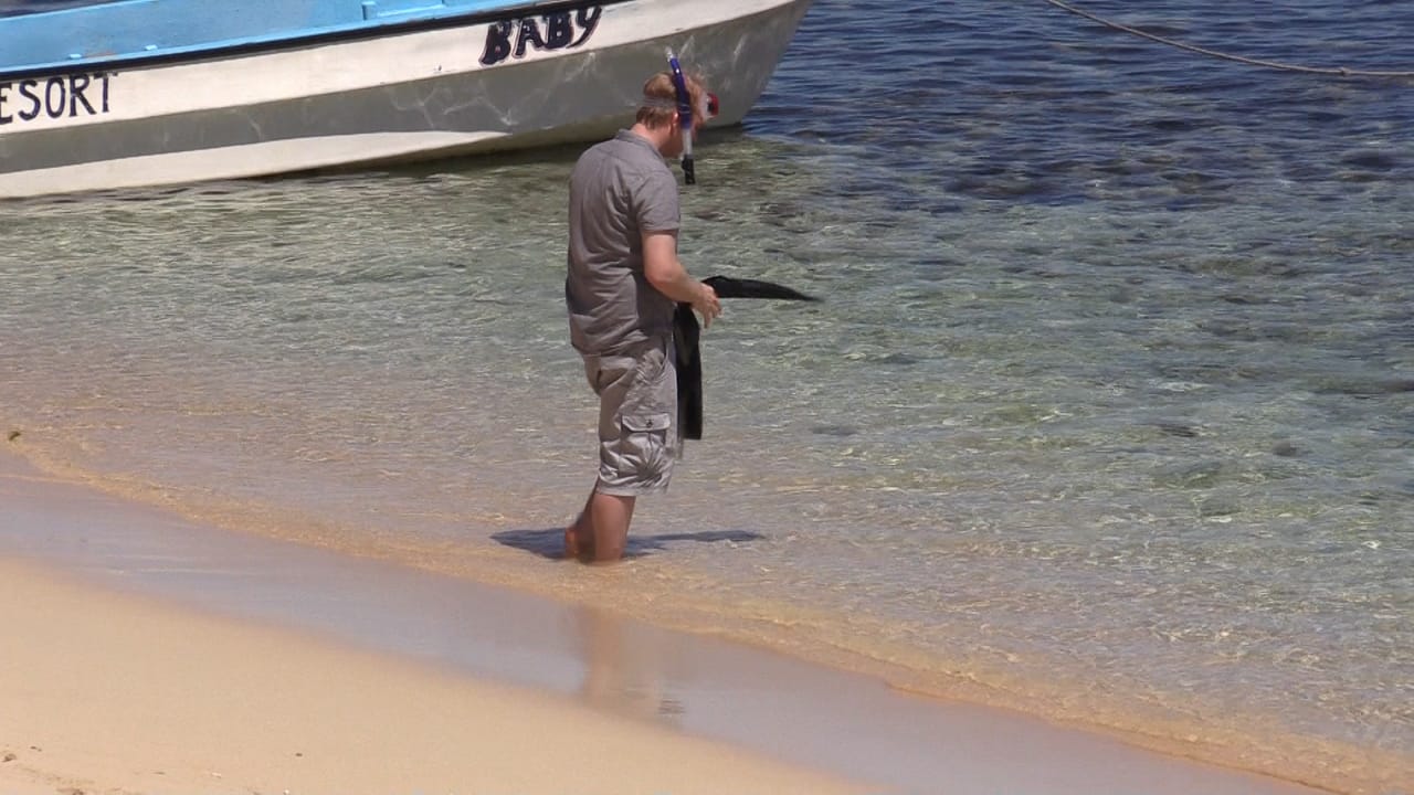 Jason is preparing to depart for the reef and take video of what can be seen. The coral reef is only 20 yards off shore supporting superb shallow water snorkeling.