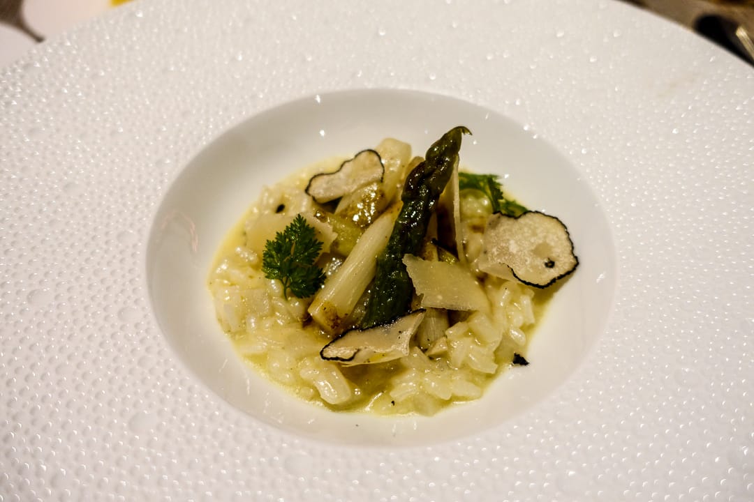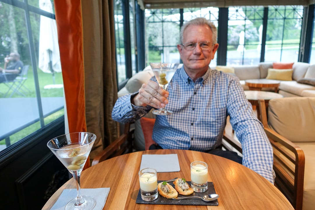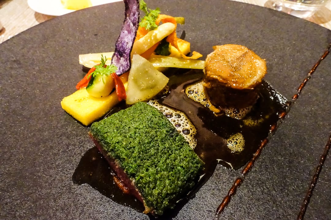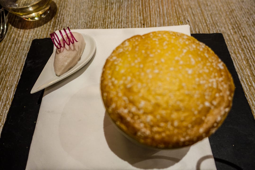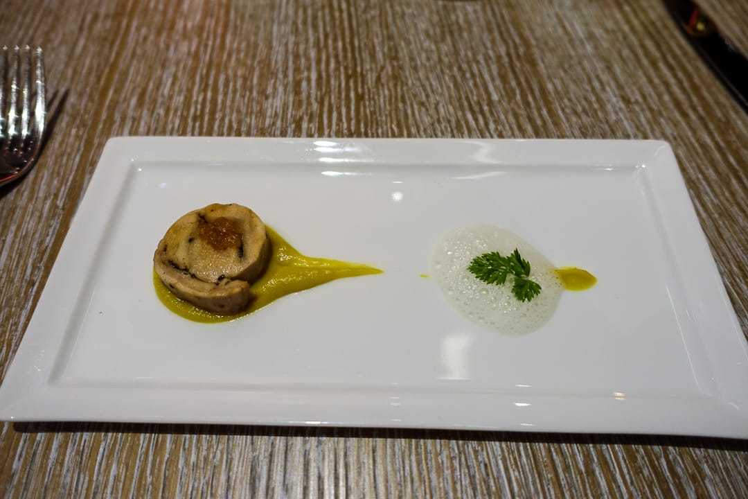 This evening was Pete’s 50th high school reunion back in San Pedro, so Jill took his picture to send to his high school buddies at the reunion. We then had dinner at the hotel restaurant, noted for its haute cuisine. Above is a shot of the amuse bouche and below, a shot of . . .
