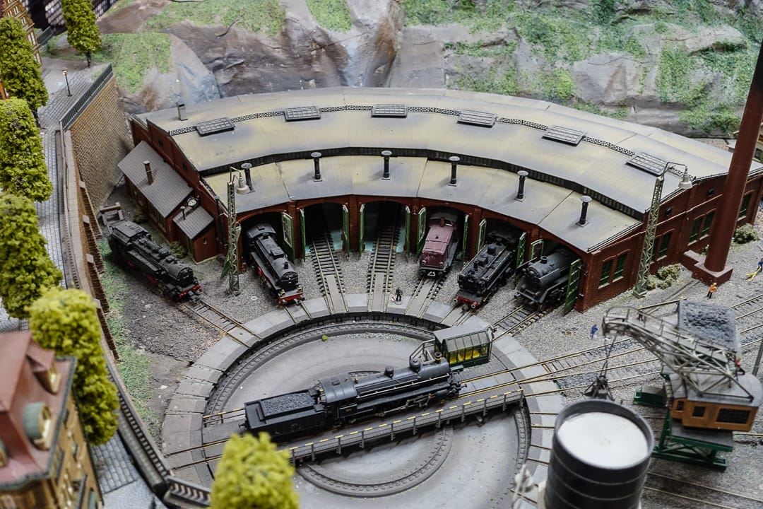There was a large operating HO scale layout featuring a roundhouse turntable.