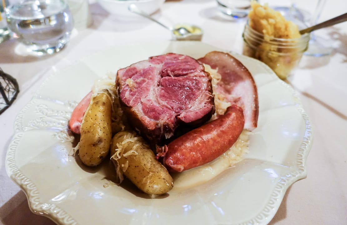 GERMAN: Choucouterie (an Alsatian selection of pork products on sauerkraut) Pete’s dream meal.