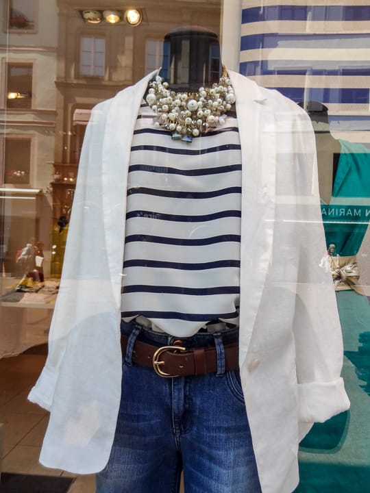 FASHION ALERT: Although almost all women in France wear the ubiquitous colored scarf around their necks, fashionably knotted, we noticed some young ladies wear gaudy jewels with their jeans, like the look in this display case.