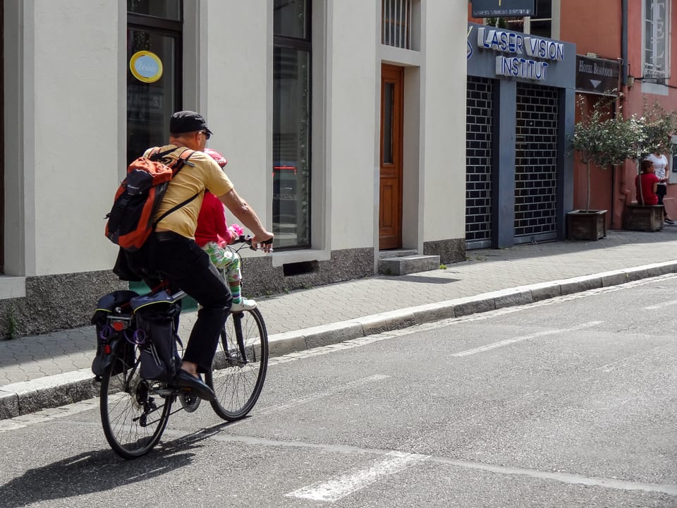 Because of the traffic and crowds of people, locals prefer to travel en velo (on bike) or . . .