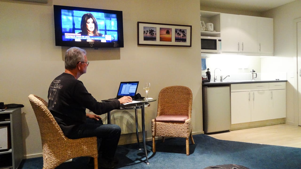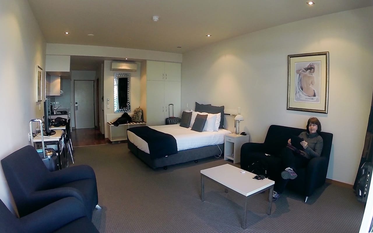 SOME NOTES ON THE HOTELS: Many inns in NZ have well stocked kitchenettes. They all have tea kettles, coffee, tea, cocoa, cold milk and cookies on hand. This one in Nelson has a fridge, stove, sink, microwave, cookware and dinnerware. Other inns have ovens, dishwashers and built-in washers & dryers. We have washed clothes every 4th day. (What a luxury to have our suitcases full of clean clothes.) Unlike LA, NZ seems to have no premium on space, so the rooms are large, and oftentimes a rental includes a second bedroom, which we have used to house our luggage.