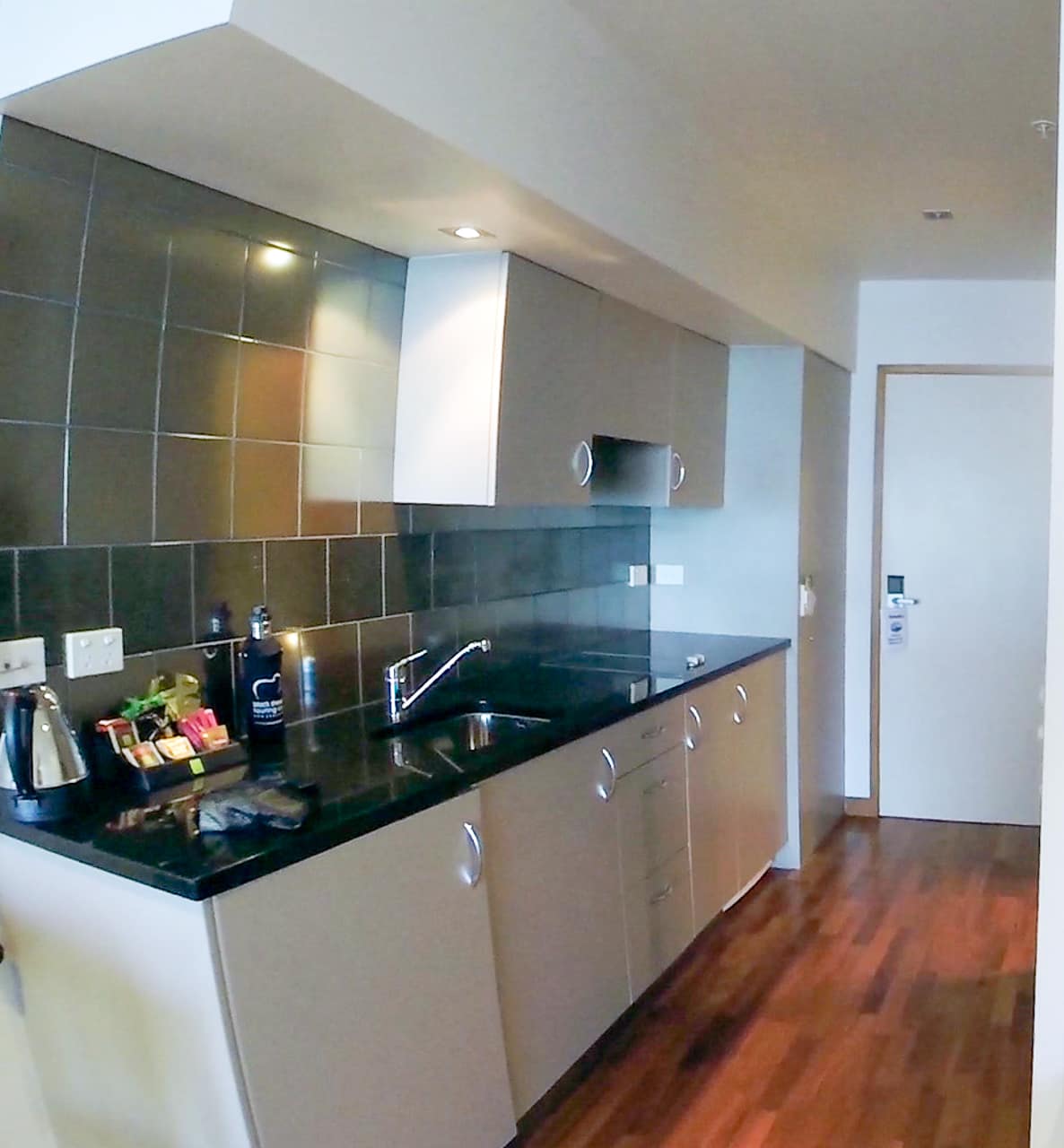 The flat-like rental includes a well stocked kitchenette with a washer / dryer combo.
