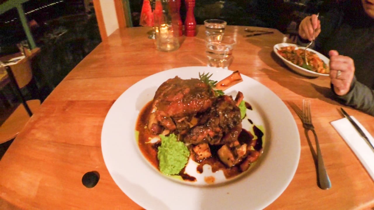 So far we have not taken a picture of the sheep that populate both islands, the most common sight in NZ, but here is a picture of a lamb shank Pete ate for dinner. The green stuff is pea pesto / puree. I just couldn’t get myself to eat one of those cute little lambs, so I ordered the vegetarian pasta.